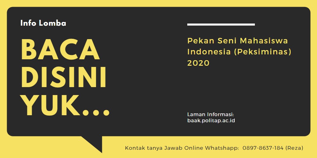 Berikut kami informasikan kegiatan Pekan Seni Mahasiswa Nasional (PEKSIMINAS) 2020 yang diselengarakan oleh Pusat Prestasi Nasional, Kementerian Pendidikan dan Kebudayaan Republik Indonesia. Adapun informasi selengkapnya adalah sebagai berikut :