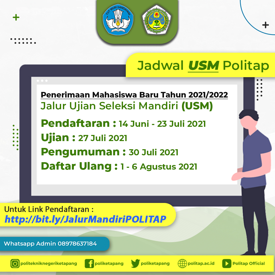 Dalam rangka penerimaan mahasiswa baru Tahun Akademik 2021/2022 Politeknik membuka Jalur mandiri yang bernama Ujian Seleksi Mandiri (USM). Jalur ini dibuka untuk umum dengan syarat-syarat dibawah ini.