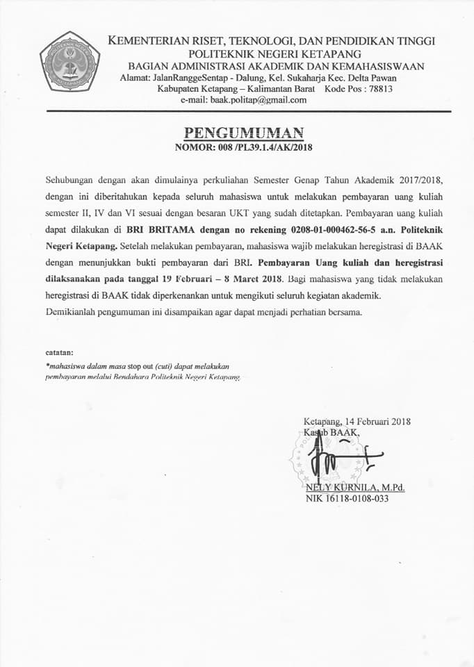 Untuk mahasiswa yang ingin registrasi sudah mulai dibuka. Silahkan langsung transfer ke rekning Politeknik Negeri Ketapang yang sudah tertulis di pengumuman, bukan ke rekening lain. Dan untuk mahasiswa yang termasuk ke daftar panggilan ke BAAK untuk datang tepat waktu.