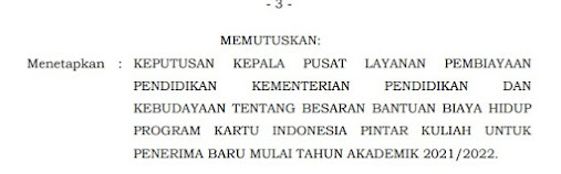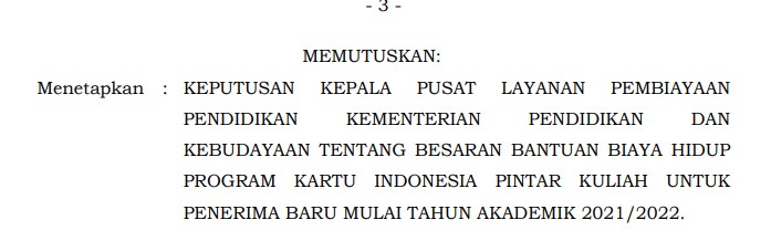 Keputusan ini hanya berlaku untuk penerima KIP Kuliah mulai tahun 2021 saja. Berdasarkan keterangan yang SK pada halaman 3, Memutuskan, Menetapkan.